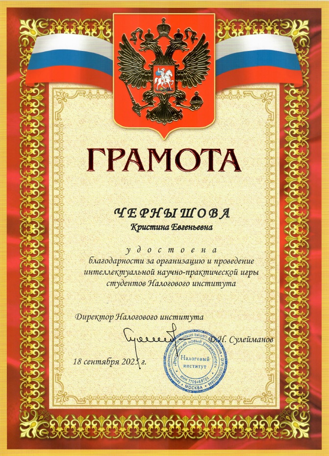 Студентка Налогового института РосНОУ Чернышова Кристина Евгеньевна удостоена благодарности за организацию и проведение интеллектуальной научно-практической игры студентов Налогового института.